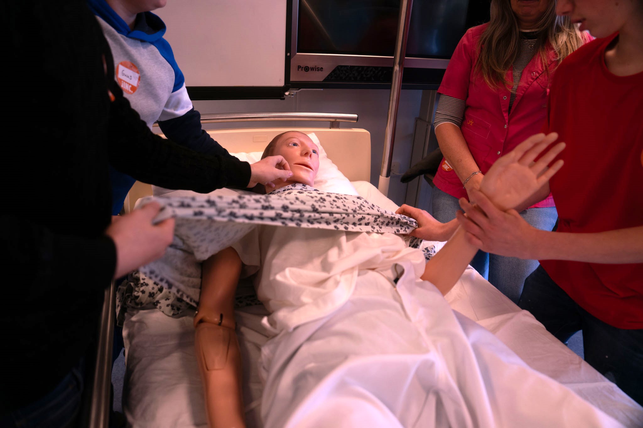 De leerlingen konden een aantal hulpmiddelen ervaren en zorgactiviteiten doen, zoals bloeddruk meten en saturatie meten. Met een ouderdomspak ervaren hoe het is als je lijf niet meer doet wat jij wilt, maar ook scheren op een ballon en een ‘patiënt’ in bed aankleden.